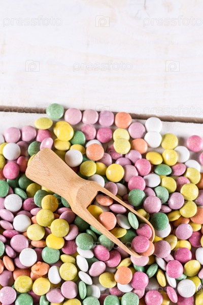 Куча красочных круглых конфет с деревянной ложкой