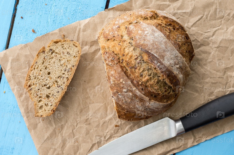 Здоровый круглый черный хлеб на столе с ножом