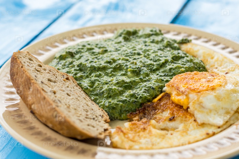 Вареный шпинат с жареным яйцом и кусочек хлеба