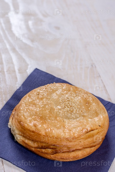 Круглая лепешка из слоеного теста с кунжутом