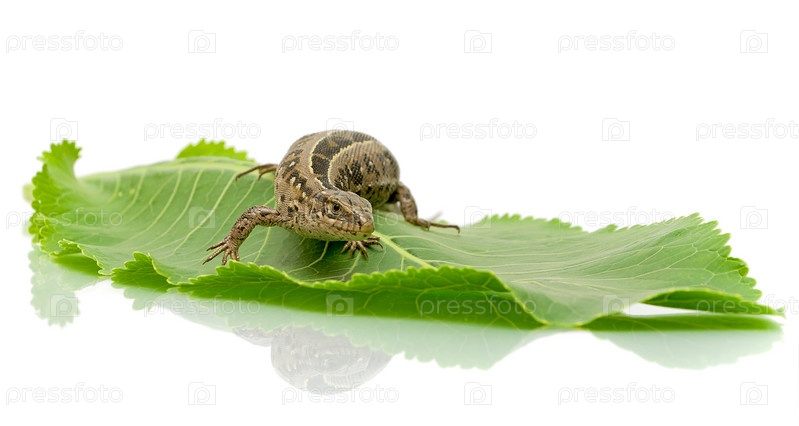 Ящерица сидит на зеленом листе, изолированная на белом фоне с отражением