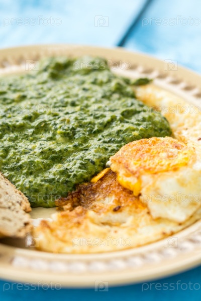 Шпинат с яичницей и ломтиком черного хлеба