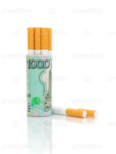 Сигареты и банкноты на белом фоне. Концепция дорогостоящей привычки