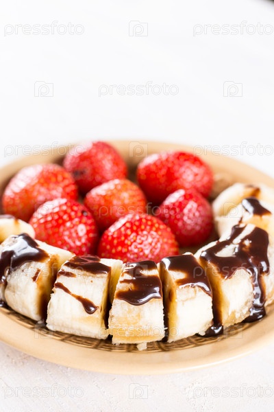 Свежая клубника с нарезанным бананом и шоколадным кремом