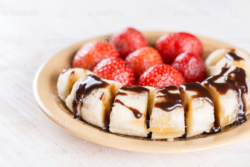 Свежая клубника с нарезанным бананом и шоколадным кремом