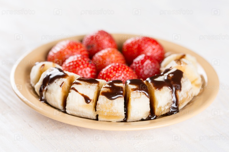 Свежая клубника с нарезанным бананом и шоколадным кремом