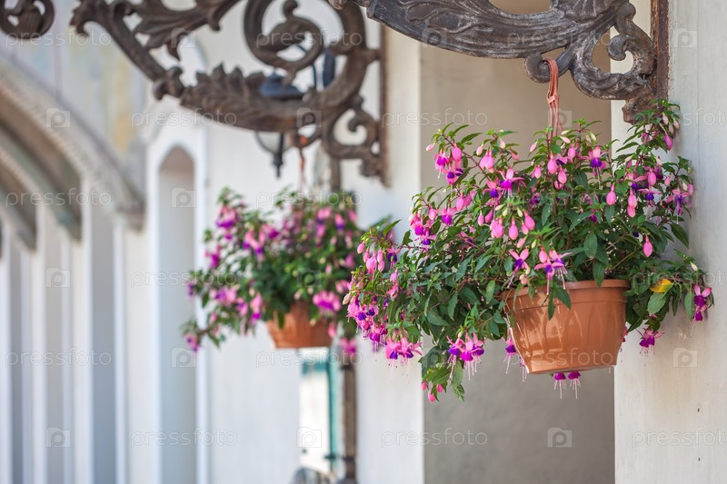 Горшок с розовыми цветущими растениями на улице старого Тбилиси