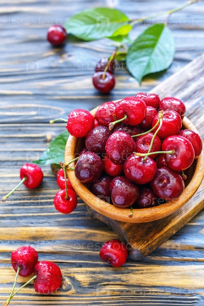 Красные сладкие вишни в деревянной миске