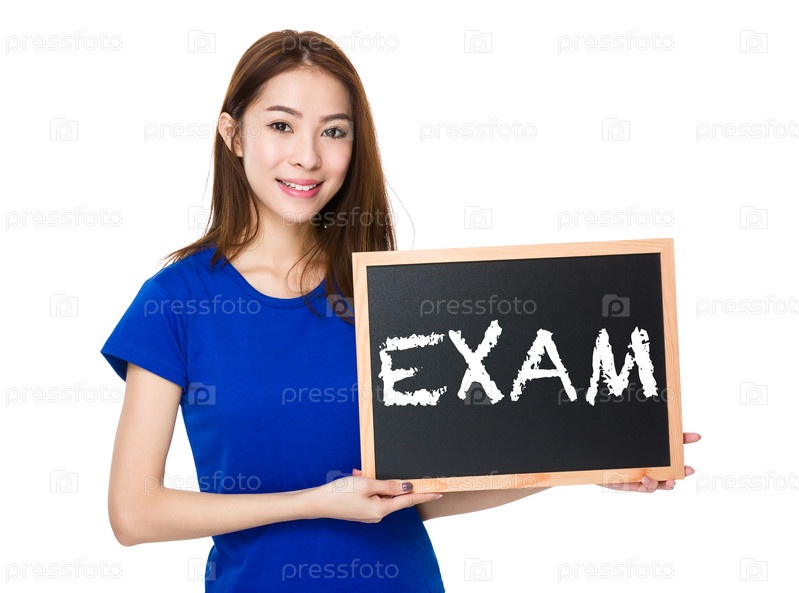 Студентка с деревянной доской, показывая слово экзамен