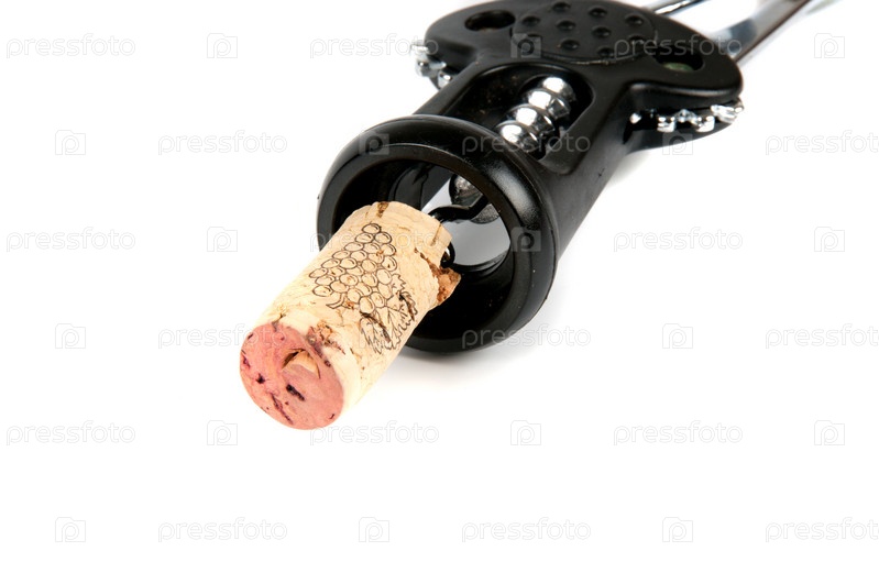 Штопор и винная пробка на белом фоне