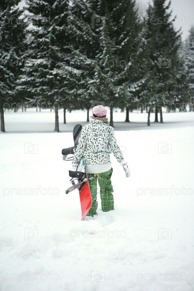Девушка со сноубордом идет по снегу