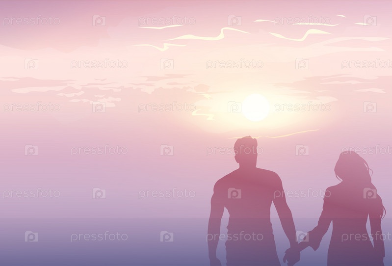 Романтическая пара, держась за руки на закате
