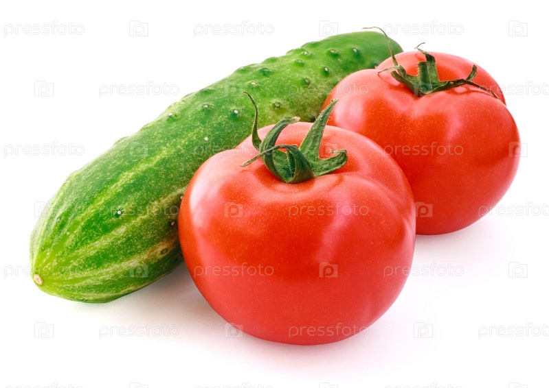 Свежие огурцы и помидоры на белом фоне