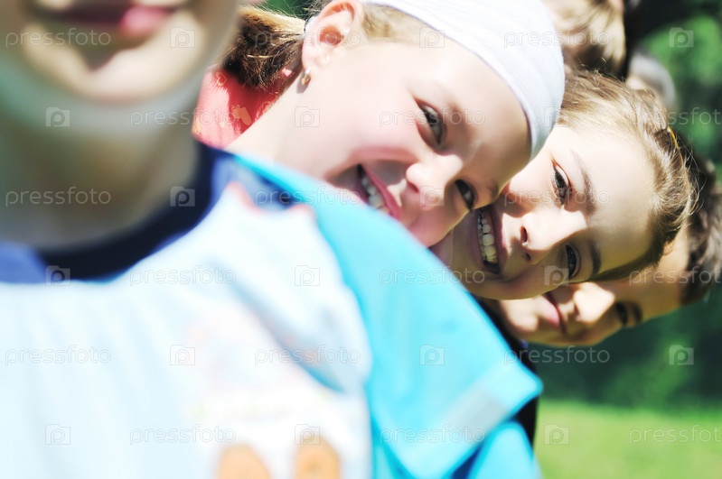 Счастливые дети веселятся на природе в солнечный день