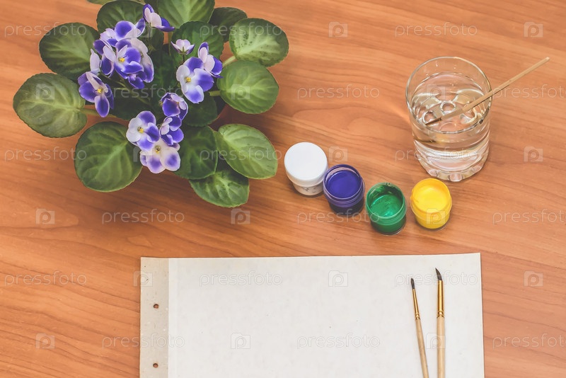 Лист бумаги для рисования, кисти, краски, и цветы фиалки