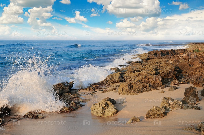Океан, живописный пляж и голубое небо