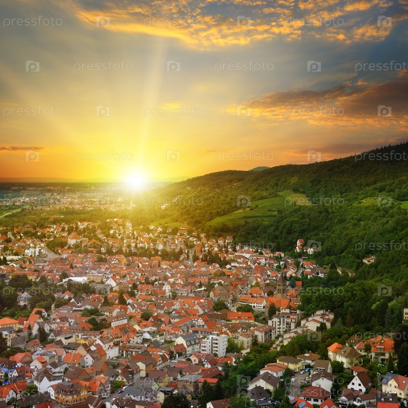 Город в горной долине и восход солнца