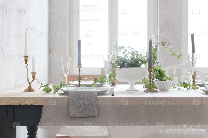 Обеденный деревянный стол, украшенный цветами и плющом