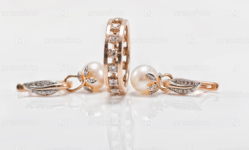 Элегантные золотые серьги с жемчугом и кольцо с мелкими бриллиантами