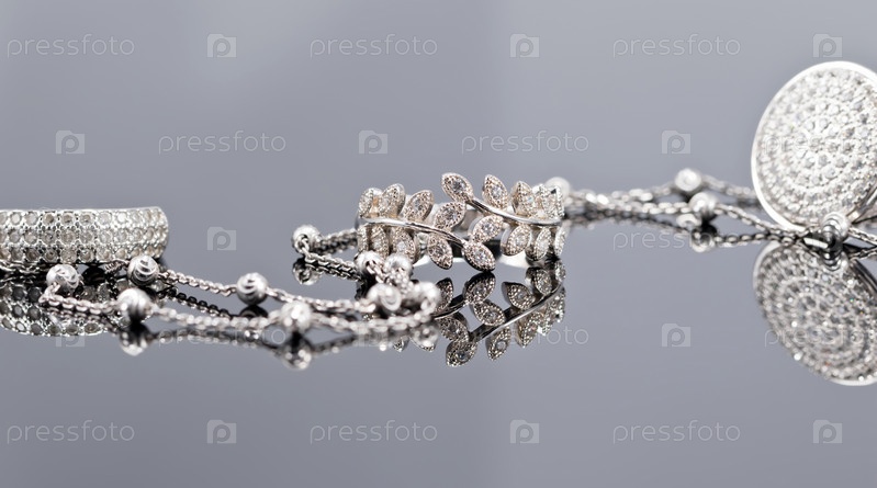 Серебряное кольцо с драгоценными камнями и тонкой серебряной цепочкой