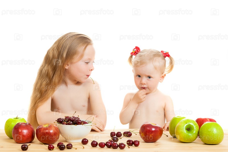 Две маленькие девочки едят фрукты