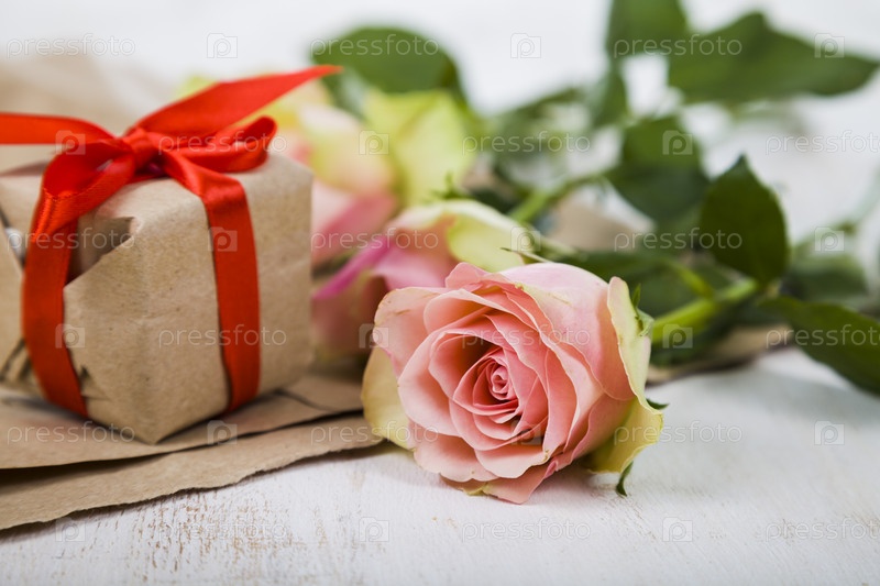 Розовые розы, подарок и сердце
