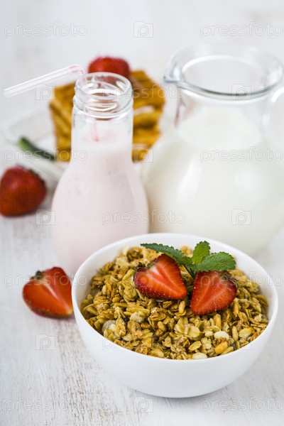 Мюсли с клубникой, молоко и фруктовые коктейли