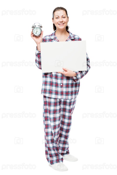 Брюнетка в пижаме с плакатом и будильником