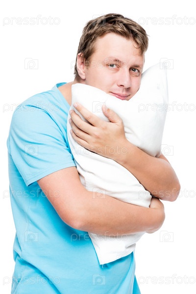 Мужчина с мягкой подушкой на белом фоне