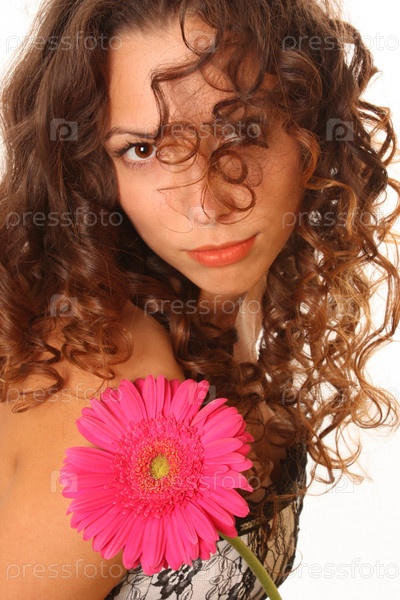 Красивая девушка с кудрявыми длинными волосами и ярким цветком