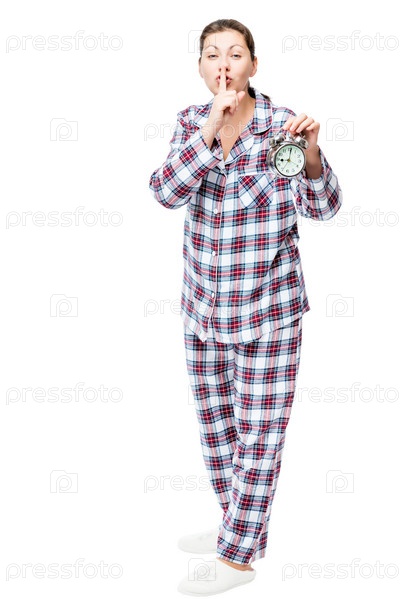 Девушка с будильником в клетчатой пижаме