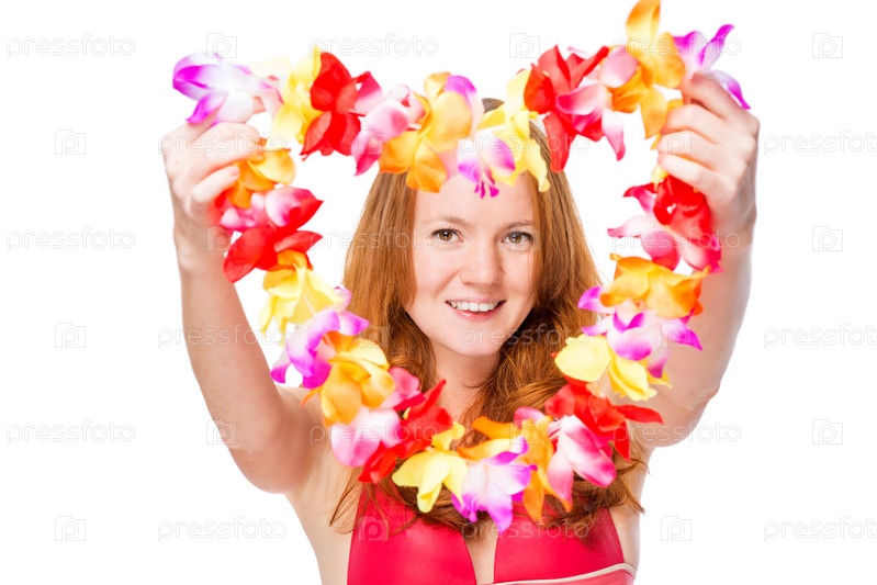 Счастливая женщина с цветочной гирляндой на Гавайях