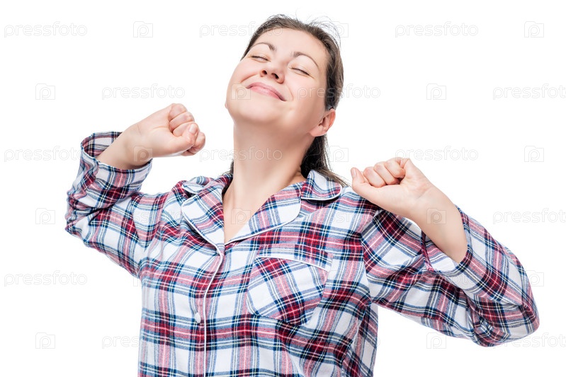 Счастливая девушка потягивается после пробуждения на белом фоне