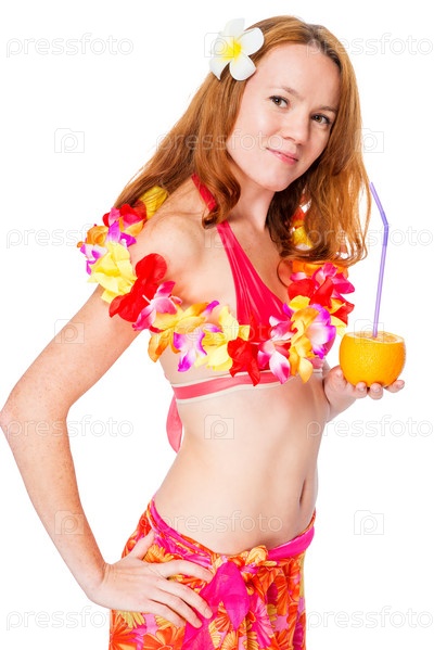 Портрет девушки в пляжном цветочном ожерелье на белом фоне