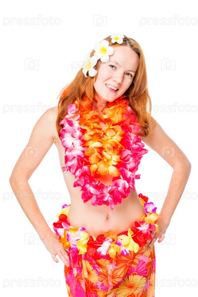 Рыжая стройная женщина в ожерелье из цветов и бикини на белом фоне