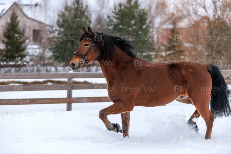 Коричневая красивая лошадь зимой на снегу