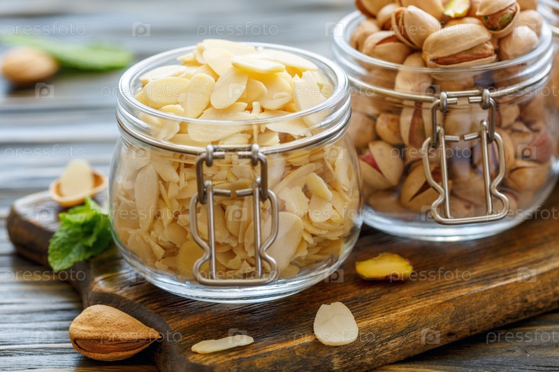 Стеклянные банки с миндальными хлопьями и фисташки