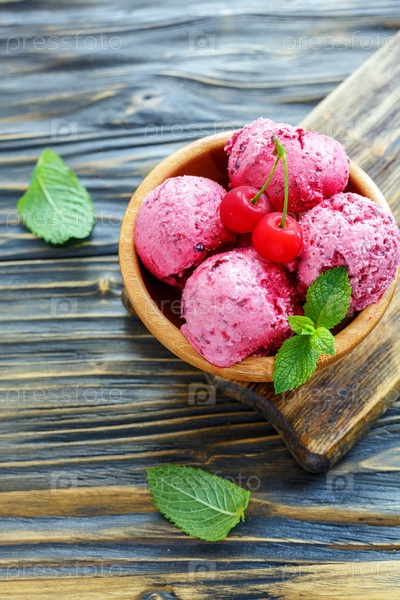 Мороженое с вишней в деревянной миске