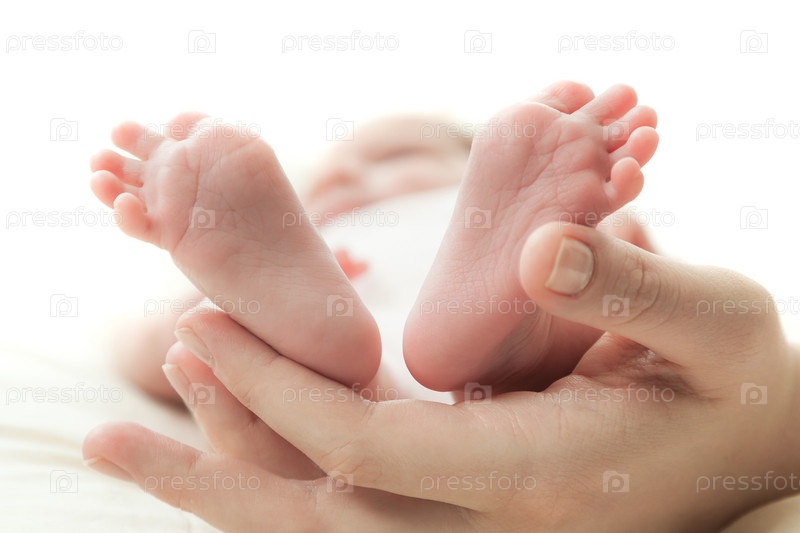 Руки матери держит ножки младенца