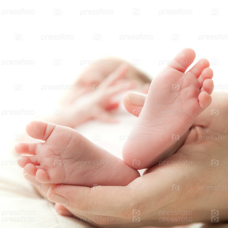 Руки матери держит ножки младенца