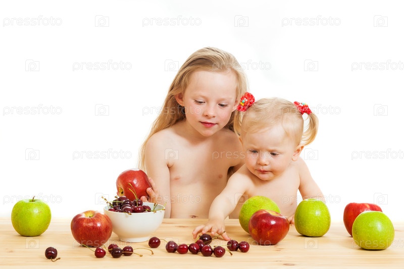 Две маленькие девочки едят фрукты и ягоды