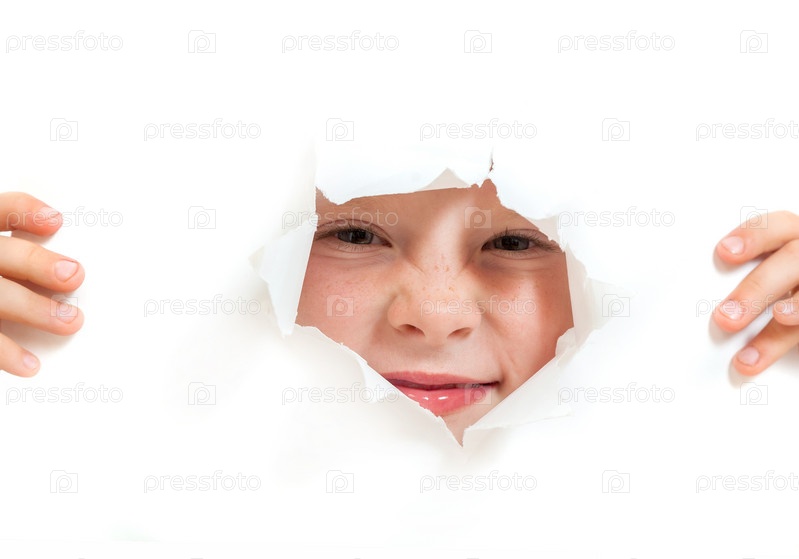Маленькая девочка смотрит через дырку в бумаге