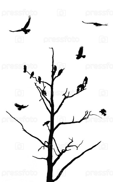 Силуэт птиц и дерева, на белом фоне