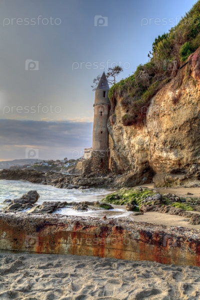 Закат над башней на пляже Виктория в Лагуна-Бич