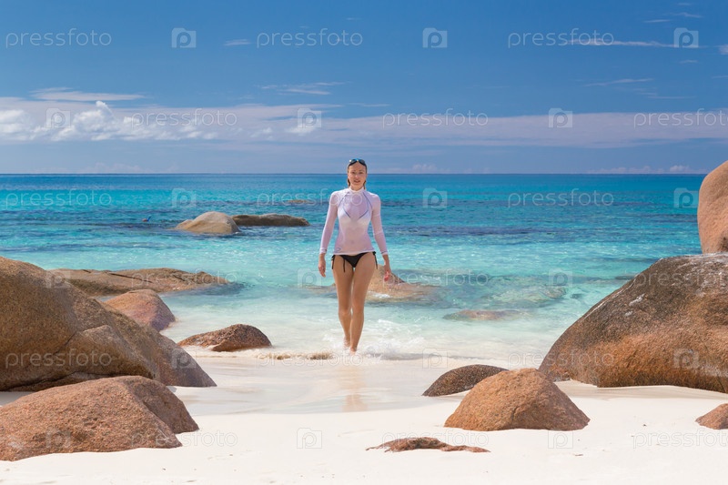 Девушка на пляже на Острове Праслин, Сейшелы