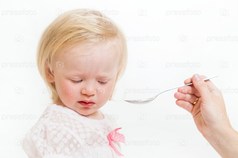 Маленькую девочку кормят с ложечки