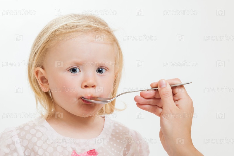 Маленькую девочку кормят с ложечки