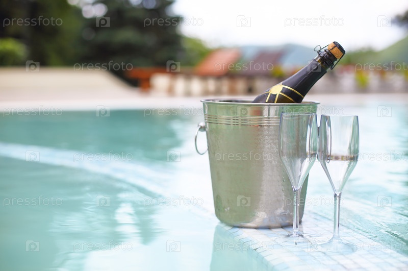 Бутылка шампанского и два бокала возле бассейна