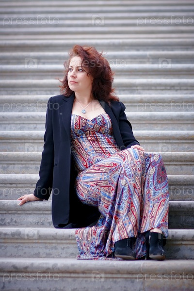 Красивая женщина в пиджаке сидит на ступенях