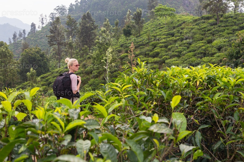Туристка наслаждаясь прекрасной природой чайных плантаций, Шри-Ланка